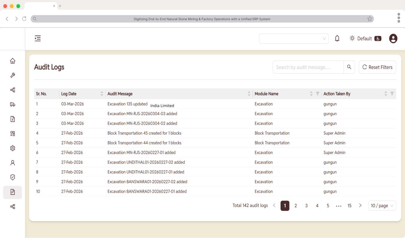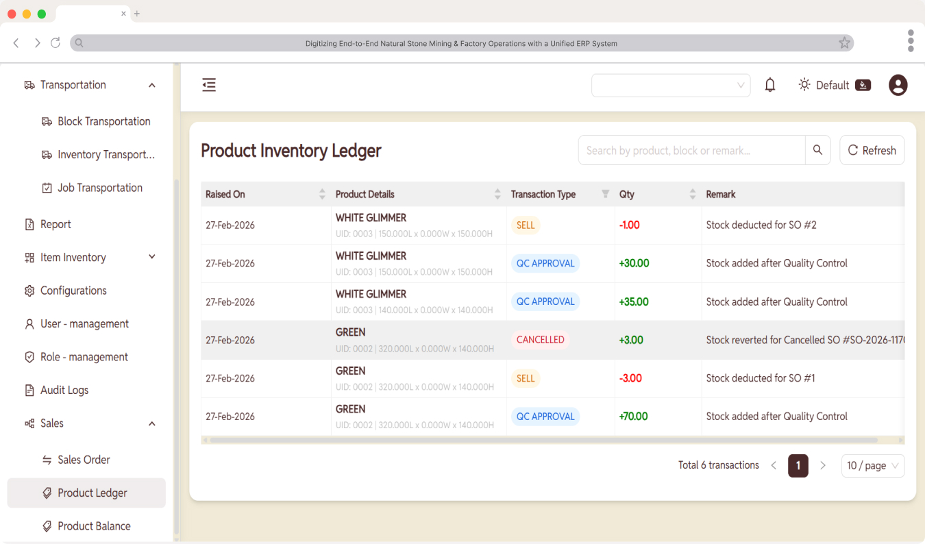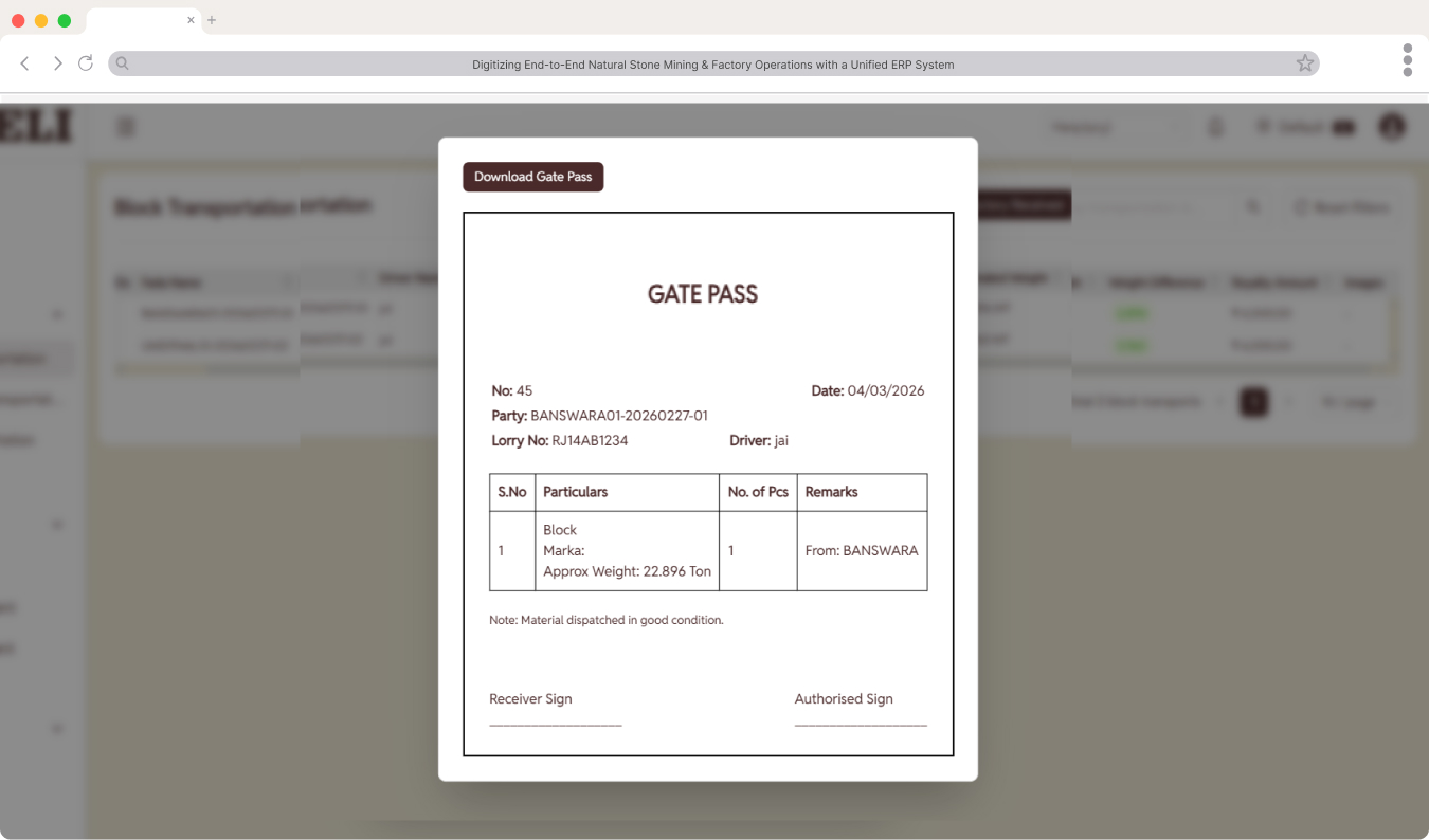 All excavation records, block identification, gate passes, and inventory movements were digitized through the ERP platform, eliminating manual registers and enabling real-time operational tracking across mines and factory locations.