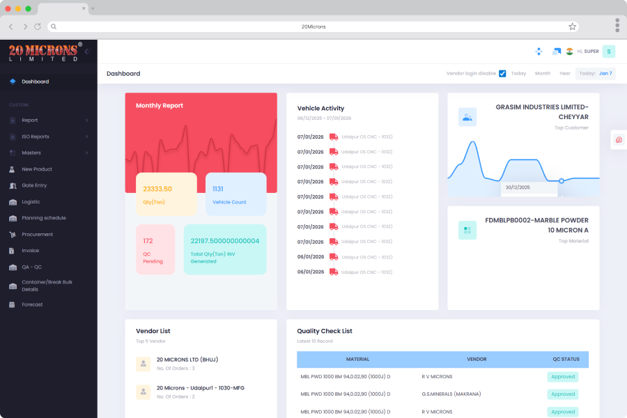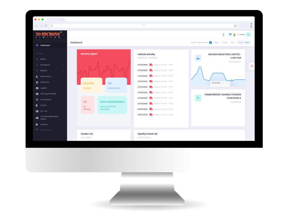 20 Microns is a listed company on the BSE and NSE, operating in the manufacturing and trading of multiple grades of industrial minerals. With operations spread across dozens of manufacturing plants and thousands of vendors, operational efficiency, compliance, and real-time visibility were critical to business performance.